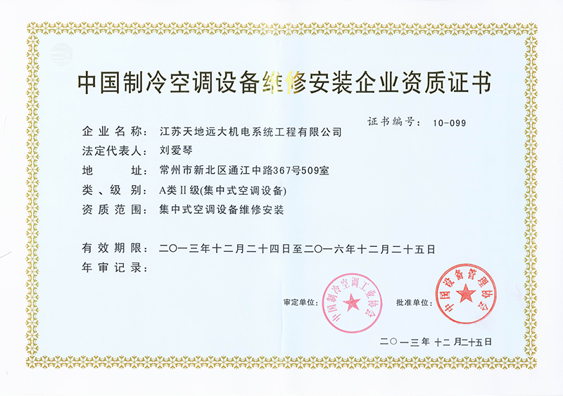 2013年12月25日,中國設備管理(lǐ)協會(huì)企業資(zī)質認證委員會(huì)第十七批認定會(huì)議(yì)在(zài)北(běi)京召開。核準了中國制冷空調設備維修安裝企業104家,江蘇有3家,江蘇天地(dì)遠(yuǎn)大作為(wèi)常州較大的(de)維修安裝企業之一,屬A類II,集中式空調設備維修安裝企業。在(zài)年終的(de)中國設備管理(lǐ)協會(huì)表彰大會(huì)上,由中國設備管理(lǐ)協會(huì)領導頒發了資(zī)質證書(shū)。