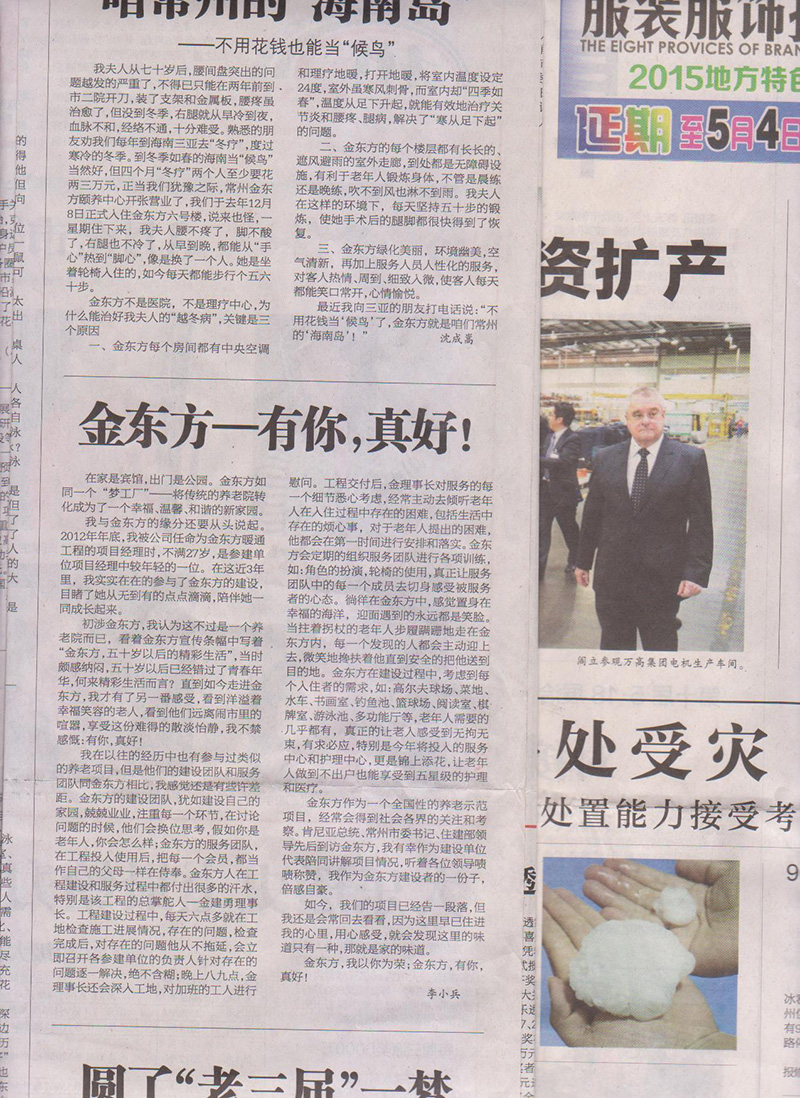 由常州日報(bào)社和金東方頤養中心共同舉辦的(de)2015“我(wǒ)看金東方”有獎征文大賽日前揭曉,我(wǒ)公司(sī)獲得了較好(hǎo)(hǎo)的(de)成績。自此次征文比賽活動啟動以來,我(wǒ)公司(sī)積極響應,鼓勵員工踴躍參與,其中李小兵的(de)作品《金東方——有你,真好(hǎo)(hǎo)!》獲得了三等獎,獲獎作品刊登在(zài)4月29日的(de)常州日報(bào)…