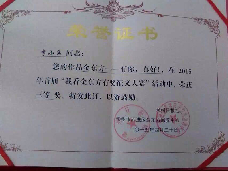 由常州日報(bào)社和金東方頤養中心共同舉辦的(de)2015“我(wǒ)看金東方”有獎征文大賽日前揭曉,我(wǒ)公司(sī)獲得了較好(hǎo)(hǎo)的(de)成績。自此次征文比賽活動啟動以來,我(wǒ)公司(sī)積極響應,鼓勵員工踴躍參與,其中李小兵的(de)作品《金東方——有你,真好(hǎo)(hǎo)!》獲得了三等獎,獲獎作品刊登在(zài)4月29日的(de)常州日報(bào)上。