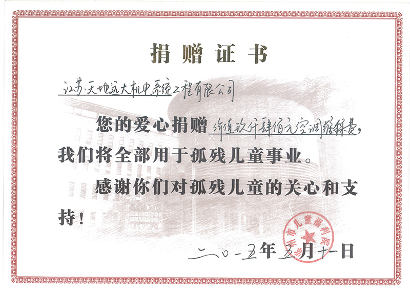 2015年5月11日,公司(sī)向常州市(shì)兒童福利院捐贈價值玖仟肆佰元的(de)空調維保費用(yòng)于孤殘兒童事業,為(wèi)孩子(zi)們的(de)成長(cháng)提供了愛心幫助。來源:綜合部